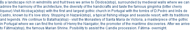 Day 1: Lisboa/Óbidos/Alcobaça/Nazaré/Batalha/Fátima (+/- 217Km /134.8 miles)